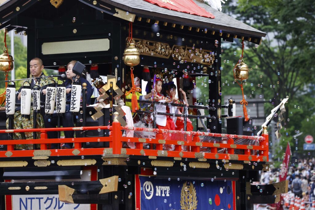 企業や団体が運行する豪華な山鉾が市内を巡行します。