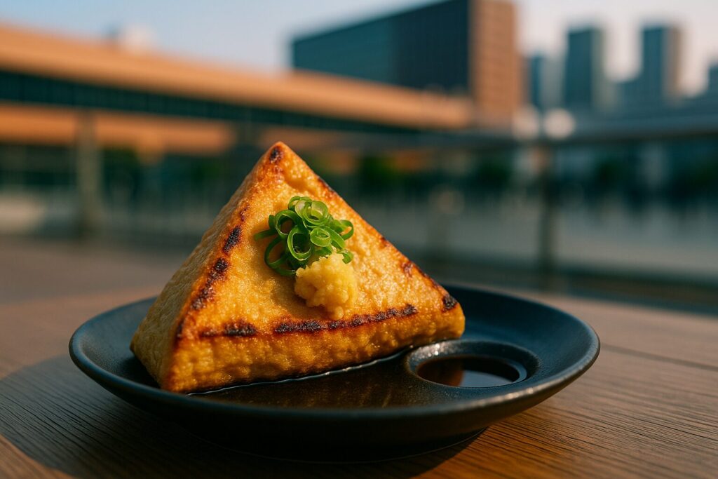 外カリ中ふわの特大油揚げ。山間の寺社エリア「定義山」名物。