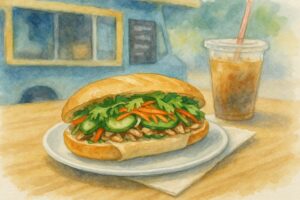 丸い米麺で、和食でいうところの「冷たいそうめん+つけ汁」に近い感覚で食べる料理も多いです。ブンチャー(焼き肉とつくねのつけ麺)や、ブンボーフエなど、少しスパイシーでハーブたっぷりのメニューが多く、フォーに慣れてきた人の次の一歩におすすめです。 - バインミーとは?