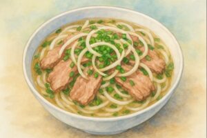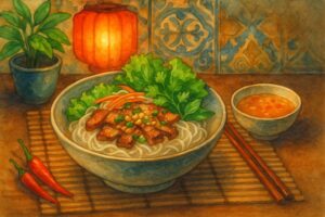 米粉で作る平たい麺のスープ料理。あっさりしただしに、牛肉や鶏肉、香草が添えられた優しい味わいで、日本人にも馴染みやすい一品です。仙台の多くのベトナム料理店で看板メニューになっています。 - ブンとは?