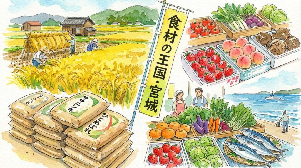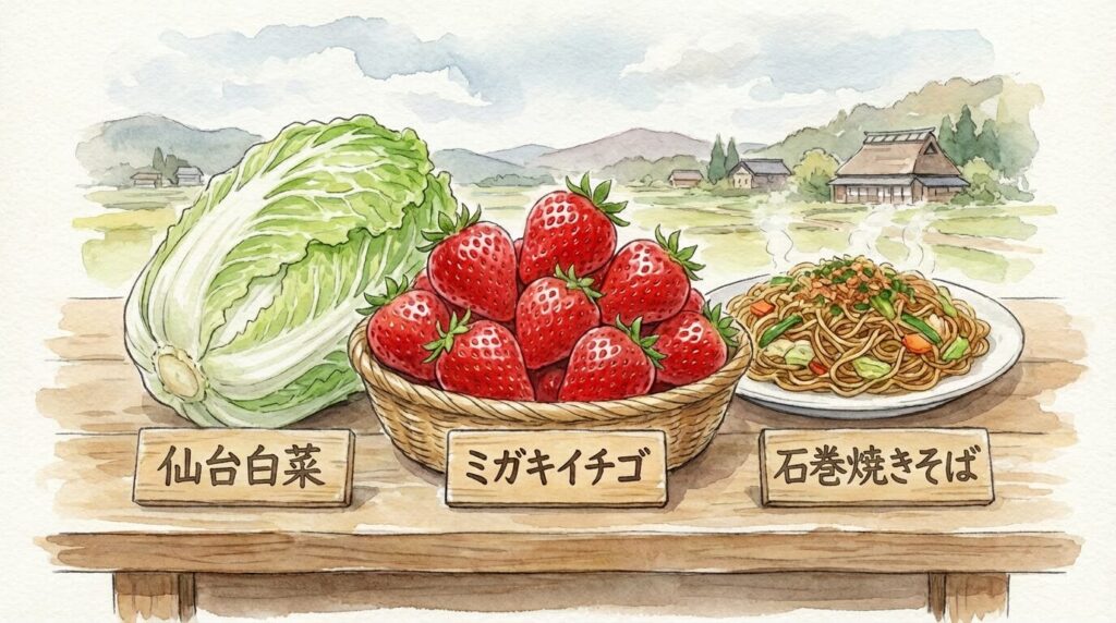 地場食材としては、仙台いちご(「ミガキイチゴ」ブランドなど)、仙台白菜、石巻焼きそばなどが有名です。