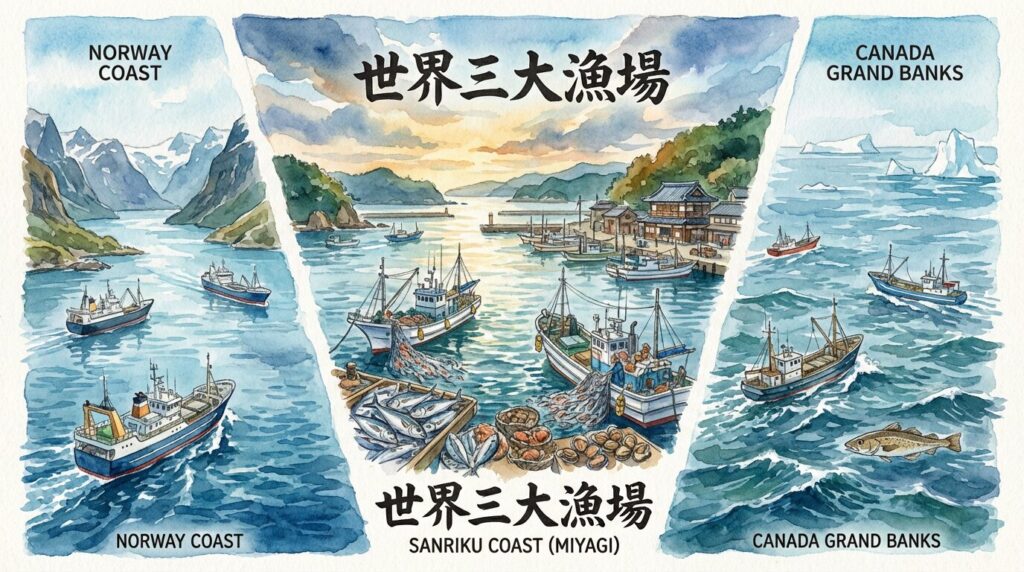 宮城県の水産業の強みは、三陸沖が世界三大漁場の一つであるという地理的優位性にあります。
