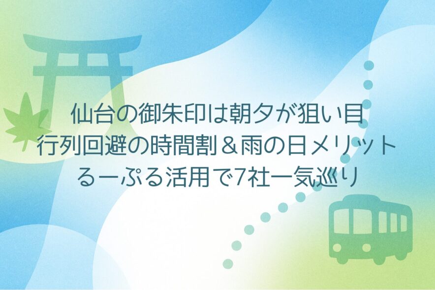 仙台の御朱印巡りは、開所直後の朝と閉所前の夕方がもっともスムーズ。さらに雨の日は参拝客が落ち着き、行列が短くなる傾向があるため、静かな境内で丁寧に参拝→御朱印の流れを作りやすいのが魅力です。移動は市内観光バス「るーぷる仙台」と地下鉄を組み合わせるのが効率的。この記事では、行列回避の時間割とるーぷる活用で7社を一気に巡るモデルコース、各社の基礎情報や雨天装備、御朱印帳の実務まで、地元目線でまとめます。