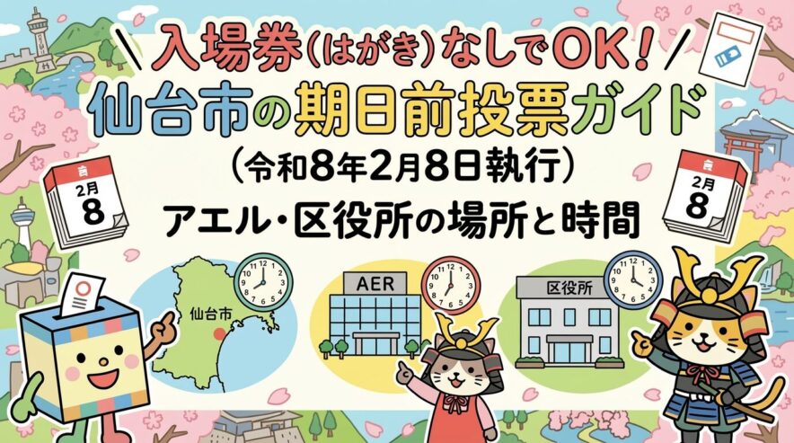 「投票日(2026年2月8日/令和8年2月8日)に行けない…」という方は、仙台市の期日前投票を使えば、投票日前日までに投票できます。この記事では、期日前投票所(区役所・アエル・商業施設等)の場所と時間、持ち物(宣誓書)、入場券(はがき)なしでも投票できる条件を、公式情報ベースでまとめました。