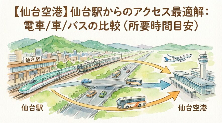 この記事では、仙台駅→仙台空港のアクセスを電車/車/バス(+タクシー)で比較し、目的別に「あなたはこれ」がすぐ決まるように整理しました。さらに「何分前に空港へ着くべき?」や、送迎・駐車場の考え方までまとめます(時刻・料金などは変更されることがあるので、最終確認は公式案内もチェックしてください)。