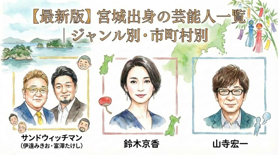 宮城県(仙台・沿岸部・県北)からは、俳優・女優、お笑い芸人、ミュージシャン、声優、アイドルなど、さまざまなジャンルの宮城出身の芸能人が全国的に活躍しています。この記事では「ジャンル別」と「市町村別」の2軸で、探しやすく・読みやすく整理しました。