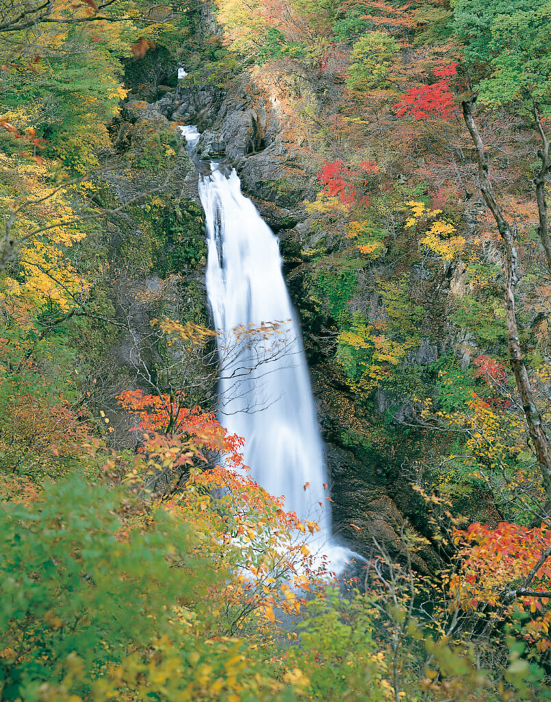 深い谷と多彩な滝が点在するエリア。見頃は概ね10月下旬〜11月上旬。道幅が狭い区間もあるため安全運転で。