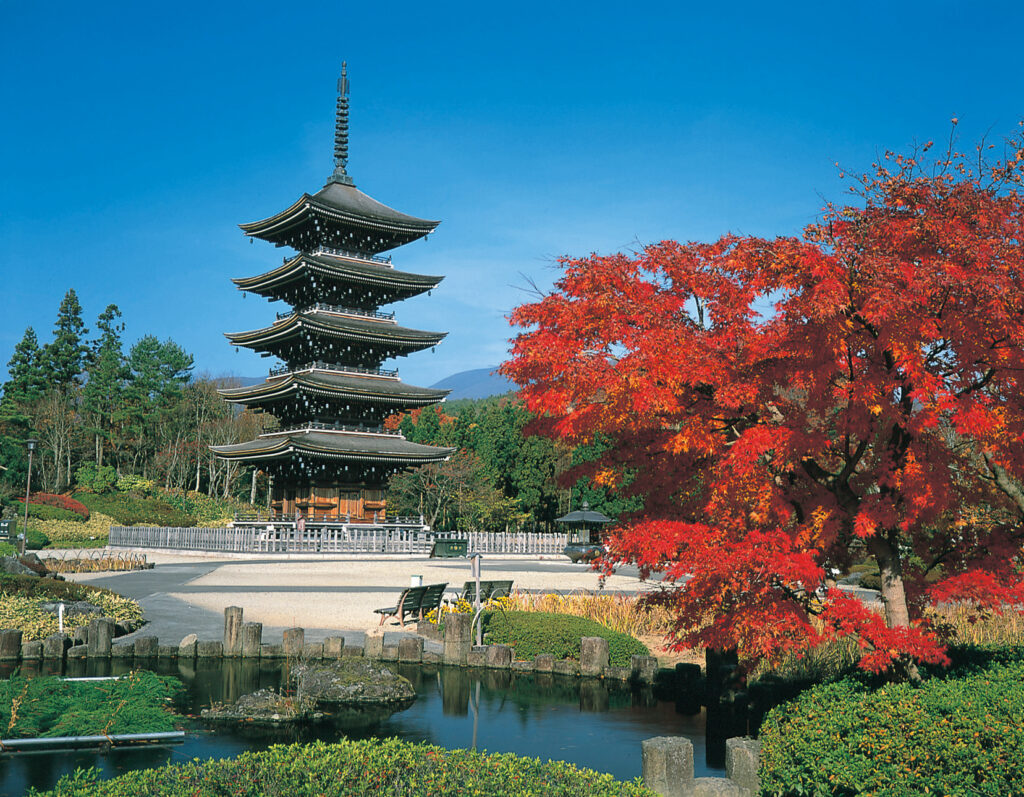 五重塔と境内の彩りが美しい人気寺院。例年は10月下旬前後にピーク。名物の三角油揚げも楽しめます。