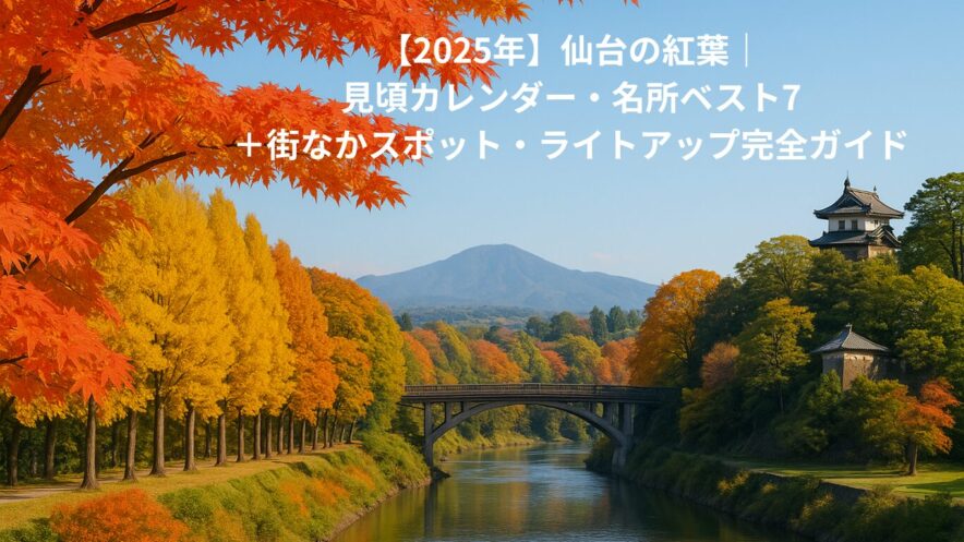 仙台の紅葉は、山間部が10月下旬〜11月上旬、市街地が11月中旬〜下旬が目安(年により±1〜2週)。本記事では、見頃の早わかり、名所ベスト7+街なかスポット、ライトアップ、アクセス、モデルコース、混雑回避と撮影のコツまで、地元目線でコンパクトにまとめました。直前は天気・色づき・公式イベント情報を必ずご確認ください。